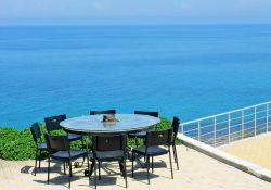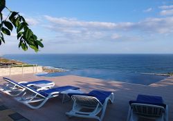 | Outside | Garden, Off road Parking, Patio, 3 Terraces + 2 Balconies, Sun Loungers ( 10 ),Tables and Chairs, Parasols, Large cliff top BBQ area, Shade. |